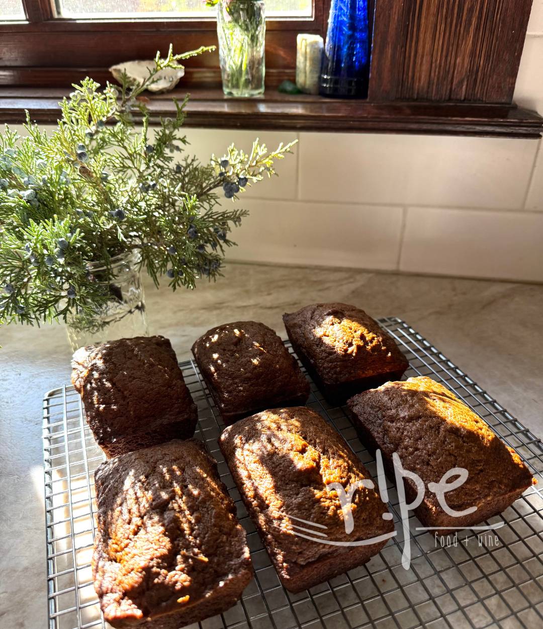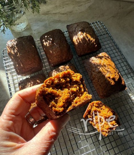 You can bake in a loaf pan, or cupcakes, or mini loaves like I have in the photo…just watch your baking time, cupcakes will be done around 15–20 minutes, mini loaves at 25–30, and a loaf pan at 40–50 minutes. When done, the breads will be set but not too firm. If you poke a toothpick in, it should come out clean, no goo. If goo, bake longer and check again but keep the oven door opening to a minimum, as the loss of heat will make everything take longer.