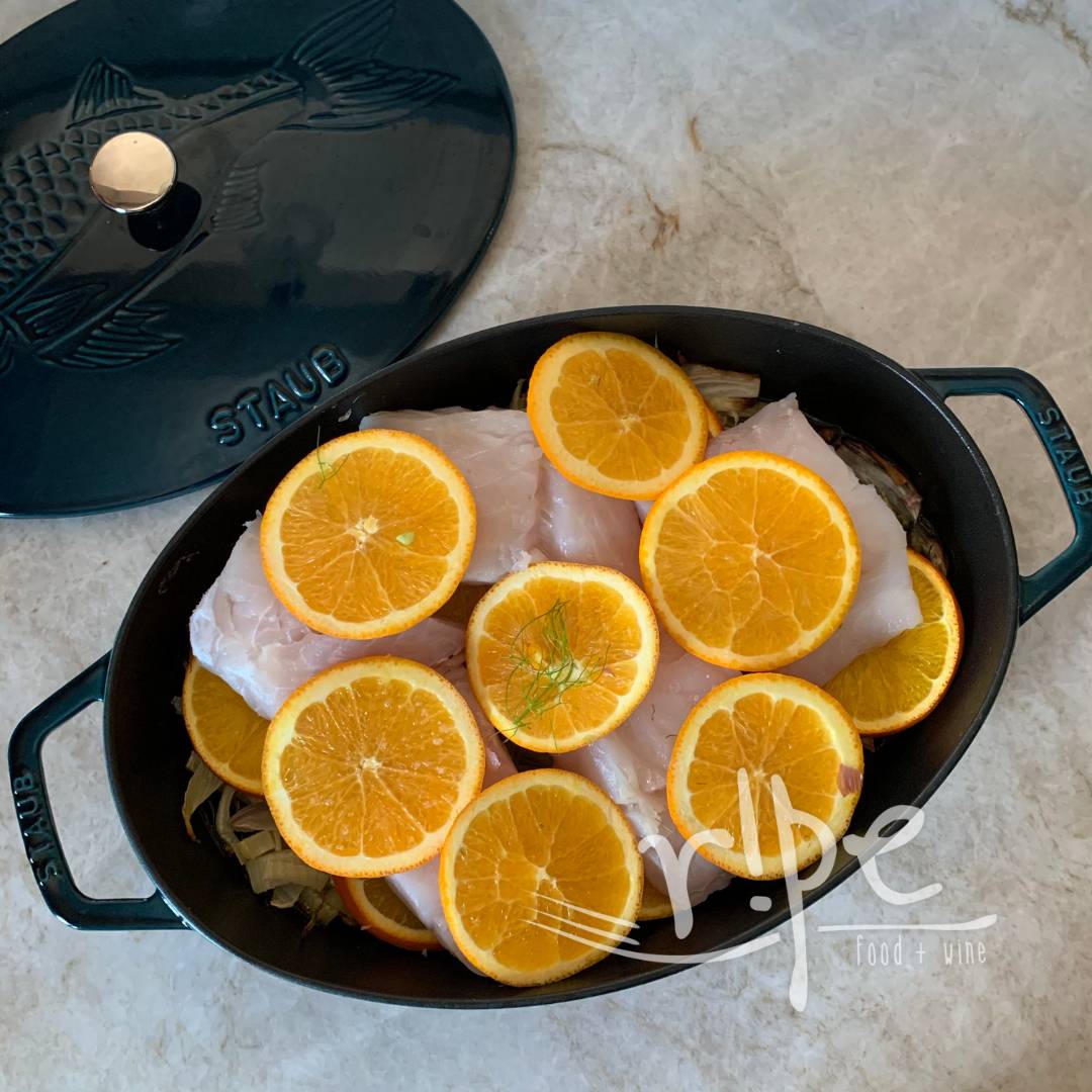Place the fish on top of the veg, spritz with half a lemon, sprinkle with a bit of salt, arrange orange slices on top, pour in a half-cup wine (and pour a glass to drink if you do; if you don’t, spritz in more lemon or orange or use a verjus, you want some liquid to help steam the fish), cover, and bake for 10 minutes.
