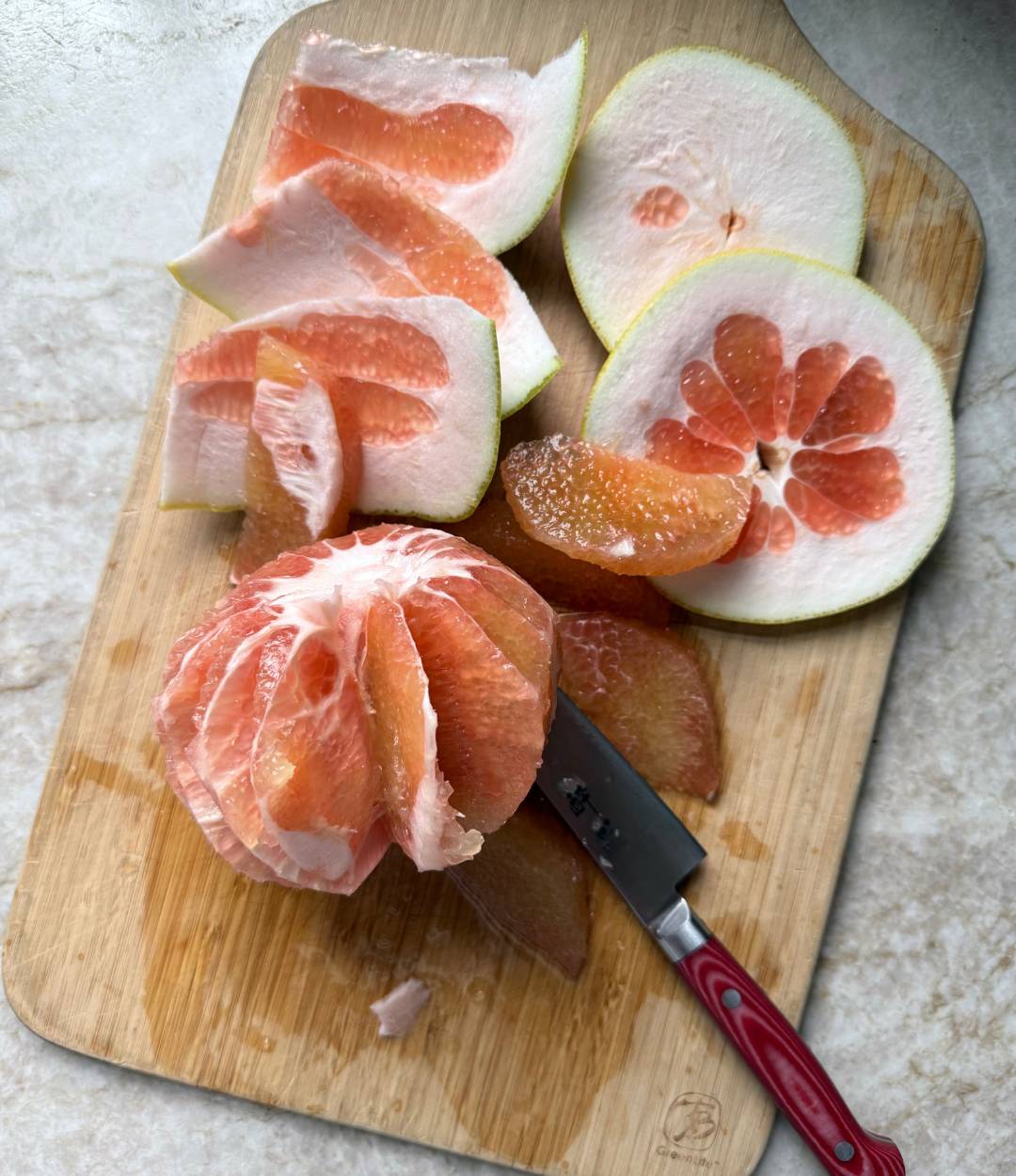 To supreme the pomelo or blood orange, cut off all skin and pith then cut out the segments. Squeeze the leftover membrane for the juice.