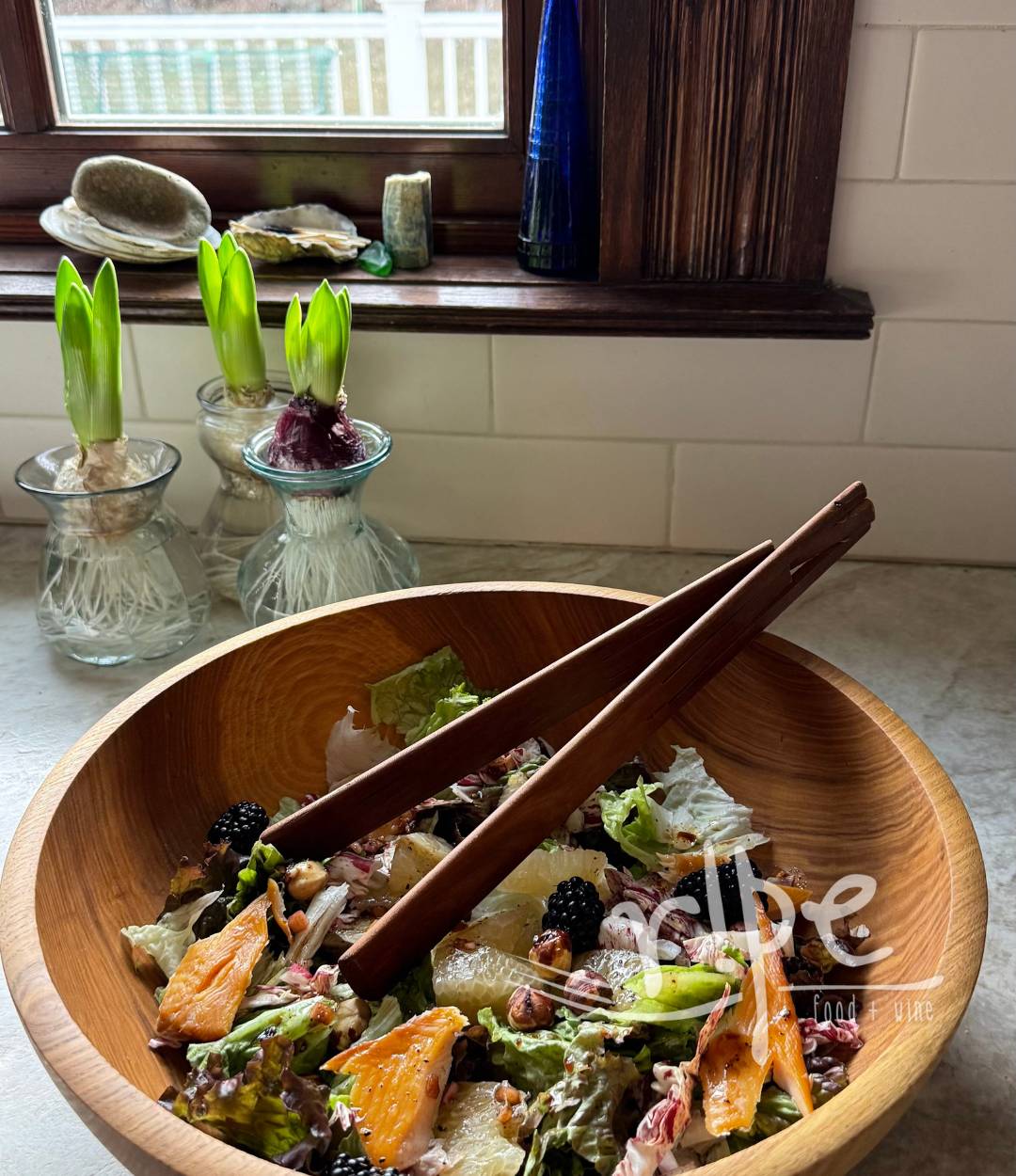 Put shallots into small bowl or glass measuring cup. Add the vinegars and let sit while you proceed with the salad prep.