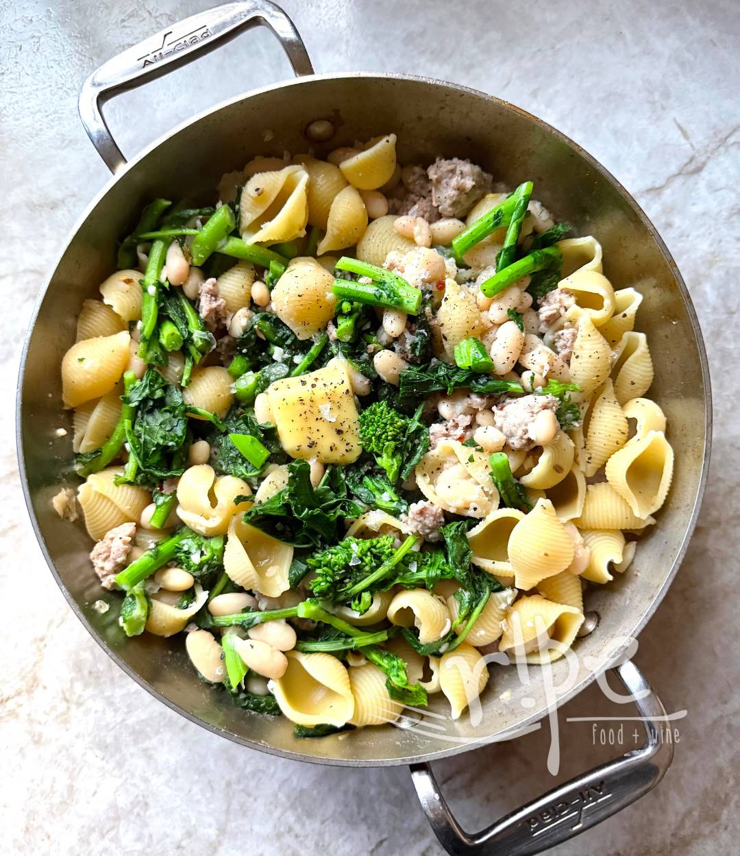 Add the cooked pasta and reserved sausage/beans to the greens and beans. Add butter, a spritz of fresh lemon juice, and enough reserved pasta cooking water to make a sauce. Simmer a few minutes to develop a velvety sauce and thoroughly cook the sausage.